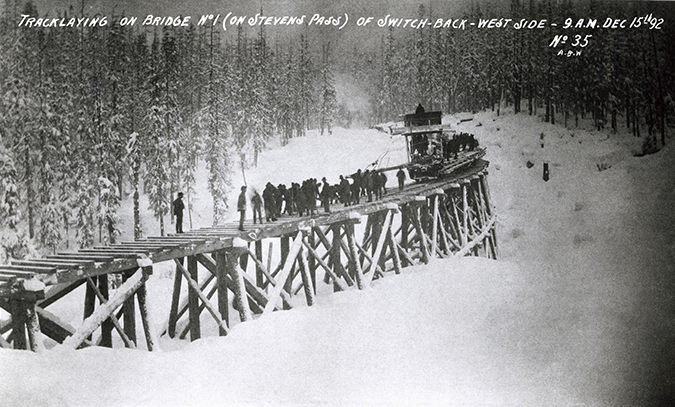 Construction on the line traversing the pass began in 1890. The final spike was driven near Scenic, Wash., on Jan. 6, 1893, completing the transcontinental project. By midsummer of 1893, Seattle and the East were linked by regular service. Today, this segment is part of BNSF’s Hi-Line and those who travel the line on Amtrak can see a bronze statue of Stevens on a ledge overlooking the pass.